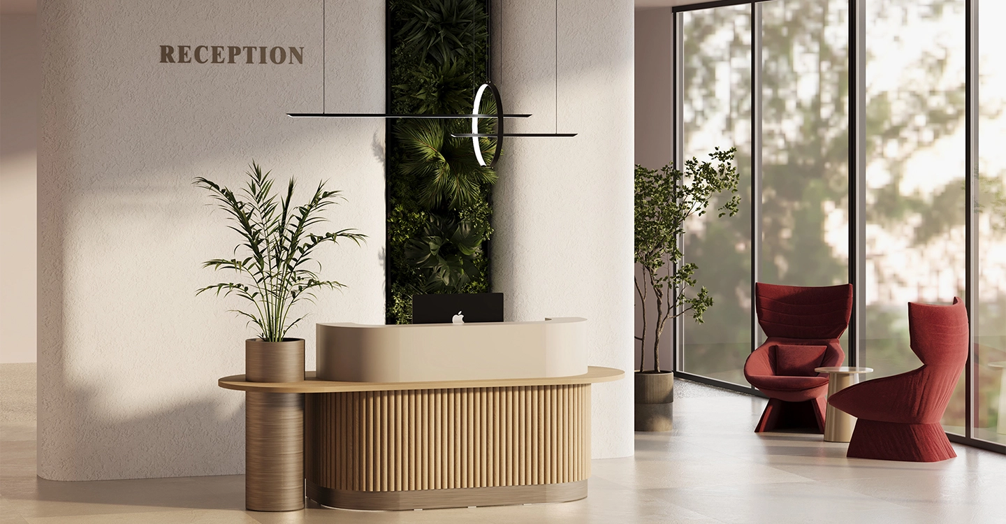 The cylindrical flower stand module, conceived as part of the design, brings a touch of nature to the space, adding warmth and prestige to the reception area. This detail, which combines function and aesthetics, transforms the counter from merely a reception unit into a design object that complements the character of the space.